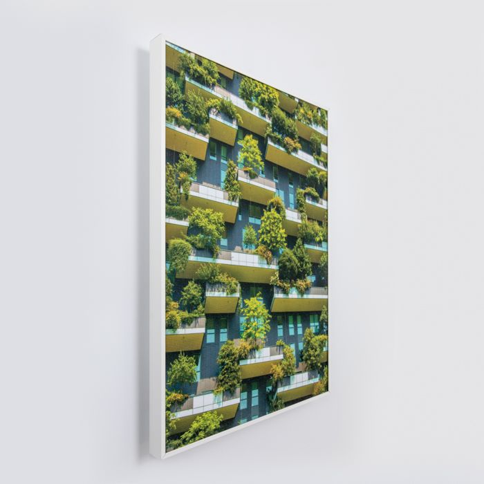 Door gebruik te maken van een fotoframe kan absorberend materiaal worden weggewerkt achter een strak gespannen en luchtdoorlatend doek. Dit doek kan bedrukt worden met een foto of kleur. Kies bijvoorbeeld voor een uitvergrootte foto, een mooie poster of een kunstwerk. Kies iets wat passend is bij het interieur of de uitstraling van het bedrijf. Het frame en doek zijn demontabel en dus kan je er ook voor kiezen te wisselen van afbeelding of het mee te nemen bij een verhuizing. Het absorberend materiaal in onze fotopanelen is gemaakt van gerecycled katoen. De dikte van dit paneel is 30 mm en is voorzien van een enkele laag absorberend materiaal.