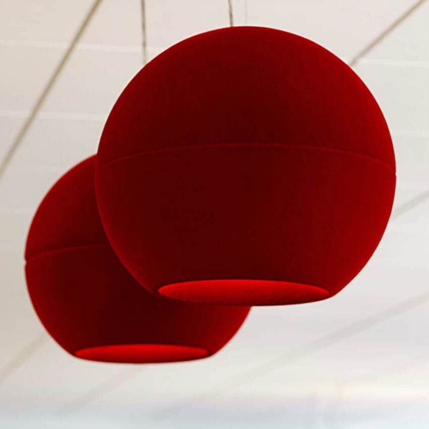 Het paneel Cherry van Akomo is een akoestisch hangend paneel voor aan het plafond, optioneel uitgevoerd met verlichting. Met zijn bolvorm verwijst dit ontwerp naar een kers en zeker in het donkerrood is de vergelijking gemakkelijk gemaakt. Het fluweelachtige uiterlijk geeft een zachte uitstraling aan elk interieur. In zowel hoge als lage ruimtes als vergaderruimtes of privé-interieurs draagt deze oplossing bij aan de optimalisatie van de akoestiek. Deze pendelarmaturen zijn verkrijgbaar zijn twee formaten en twaalf verschillende kleuren.